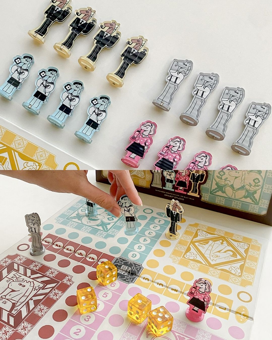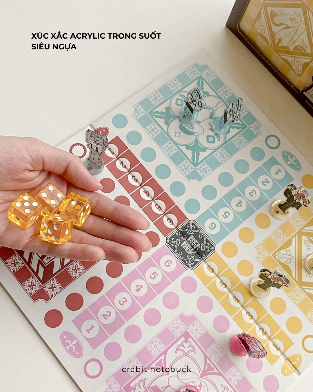 - Xúc xắc: 4 viên bằng acrylic trong suốt, màu vàng cực ngựa