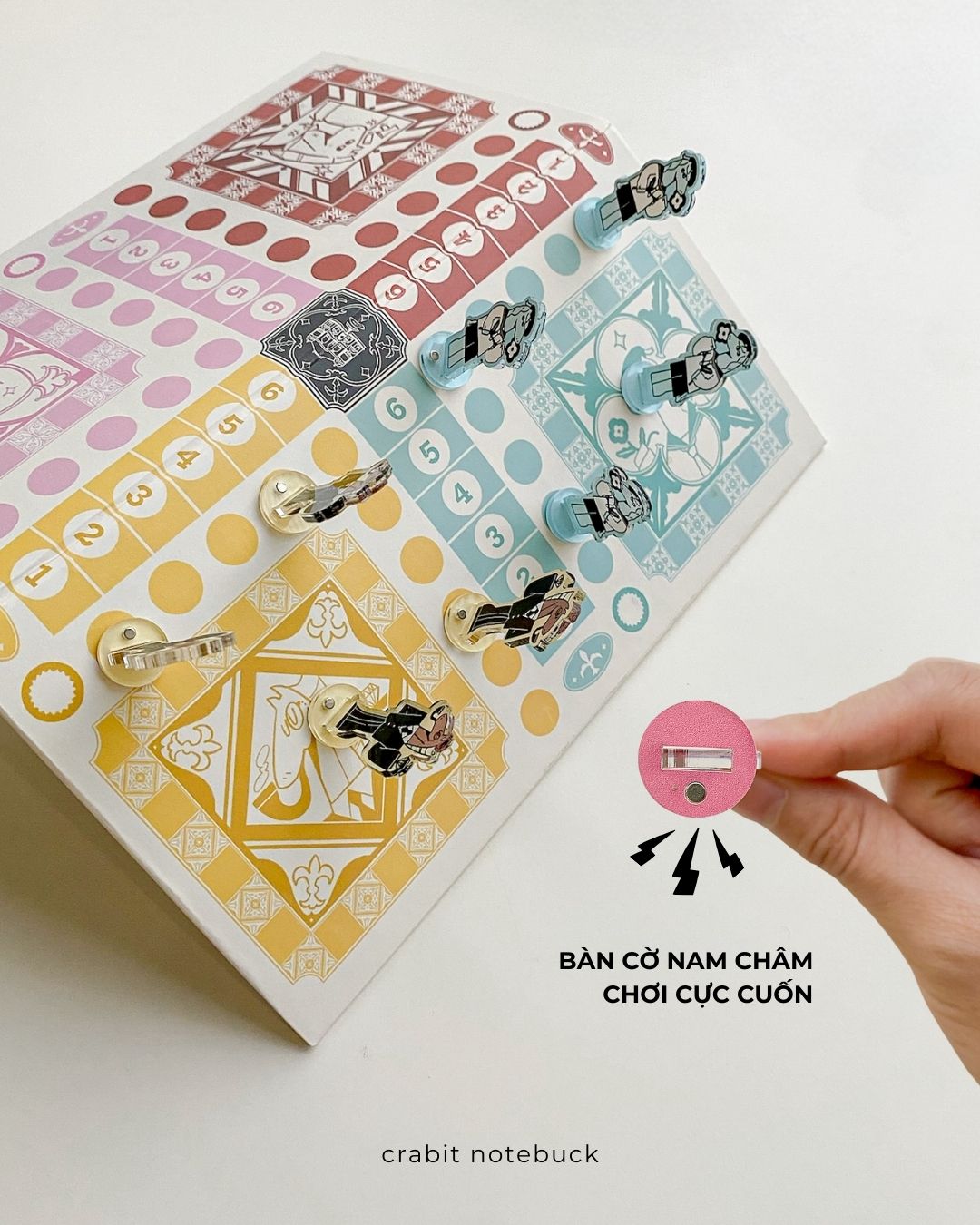 - Chất liệu bàn chơi: In giấy C150 bồi bìa nam châm