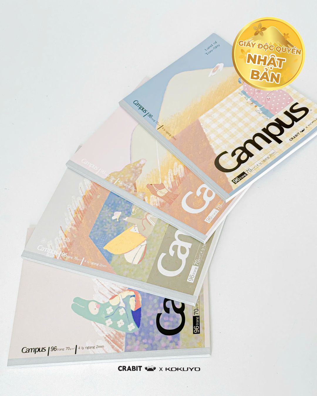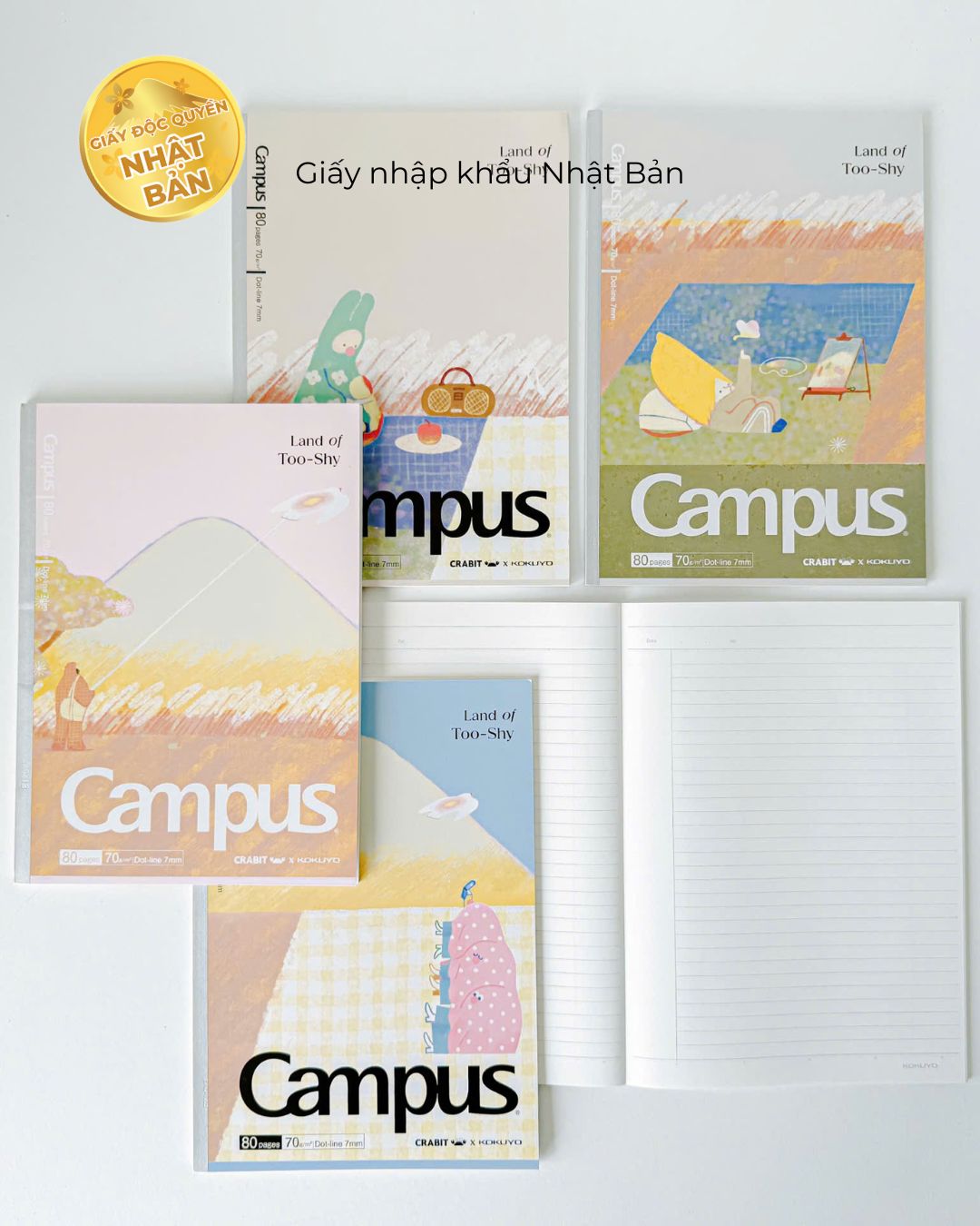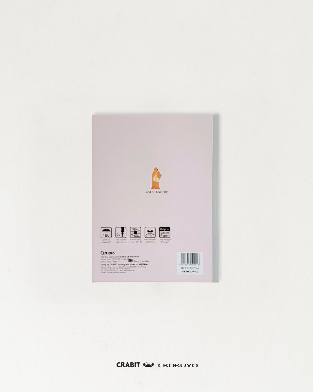 - THIẾT KẾ BÌA: được minh hoạ độc đáo bởi hoạ sĩ Crabit, với các nhân vật của Too-Shy Land, nổi bật với công nghệ in phủ UV điểm từ Kokuyo khiến mỗi cuốn vở như một bức tranh nghệ thuật.